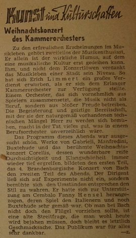 Wohlwollend aber durchaus fachkundig wurde das neue Orchester 1946 in der Zeitungskritik kommentiert. Die Stadt Erlangen hatte ein Laienorchester, dessen Engagement dem Kulturleben musikalisches Niveau verlieh.